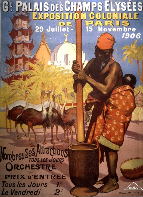 Les expositions coloniales cherchent à répondre à cette curiosité de la population. L’année 1906 voit l’organisation d’une exposition à Paris mais également à Marseille. Le principe en est simple : il s’agit de reconstituer des espaces dédiés à la découverte des territoires colonisés. Tous les domaines sont concernés : l’architecture, les modes vestimentaires, la façon de vivre, les pratiques rituelles… Pour ce faire, de véritables villages indigènes sont construits et des personnes sont déplacées pour peupler ces décors factices. Quelques animaux caractéristiques accompagnent ces populations. La représentation est prête, les spectateurs peuvent affluer, les zoos humains sont à la mode.