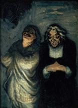 Les deux acteurs comiques de Daumier déploient tout leur génie pour exprimer des sentiments contradictoires : l’acteur de droite, les yeux au ciel, semble triompher avec un rictus de satisfaction, alors que son compagnon, tête baissée, grimace de colère et de déception. Cette paire de comédiens, peinte avec force, joue Les Fourberies de Scapin de Molière, auteur que Daumier admirait beaucoup.